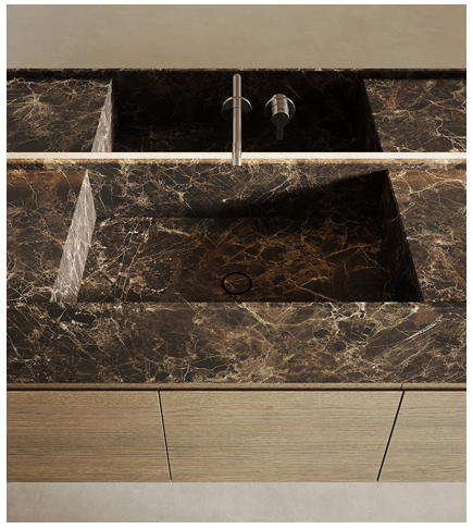 Nouvelle collection de vasques et de baignoires en marbre : SCALA. Il s’agit d’un programme modulaire composé de plans de travail et de vasques en marbre, entièrement réalisés sur mesure.