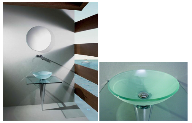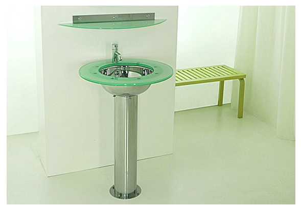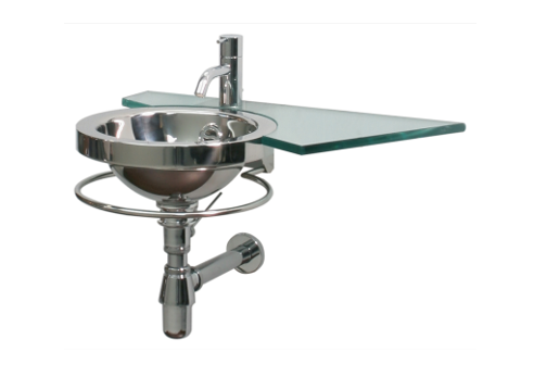 Lavabo free-stanfding, composé d’une vasque ronde hémisphérique en acier inox avec une bordure en verre trempé, encerclant le bord de la vasque. La vasque est posée telle un piedestal sur une colonne cylindrique visée au sol.