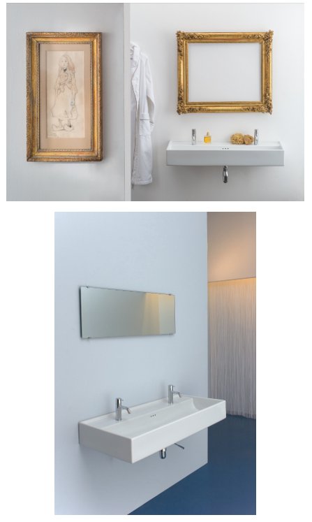 Un lavabo mural installé le long du mur, en céramique blanche pour une ou deux robinetteries sur le lavabo ou au mur (VOLA). Une inspiration autour de l’abreuvoir, de la table de lavage ou encore, le souvenir des lavabos collectif des pensions d’écoliers….ou autres aventures…