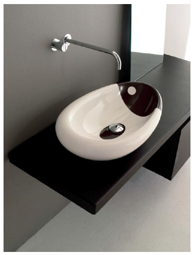 Orca, lavabo à poser, une ligne douce réalisé en Velvet Blanc, Velvet bicolore ou en pierre portugaise. Peut être combiné à divers plans en bois, acier inox ou Wengé plus classique.