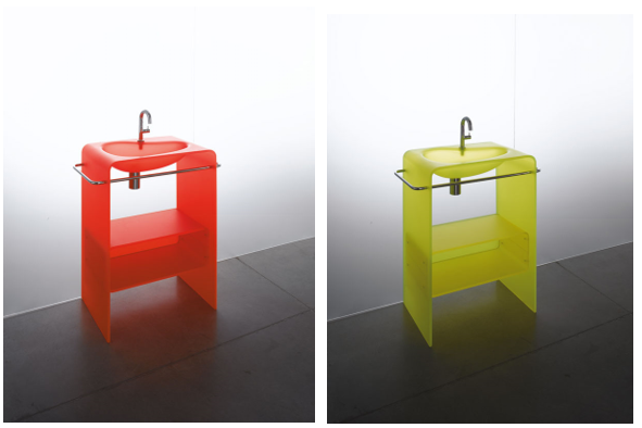 Lavabo freestanding thermoformé en une pièce unique en acrylique translucide avec 1 porte-serviette porteur en acier, latéral et facial et 1 double étagère en jaune acide ou rouge cerise, pour une robinetterie sur plan.