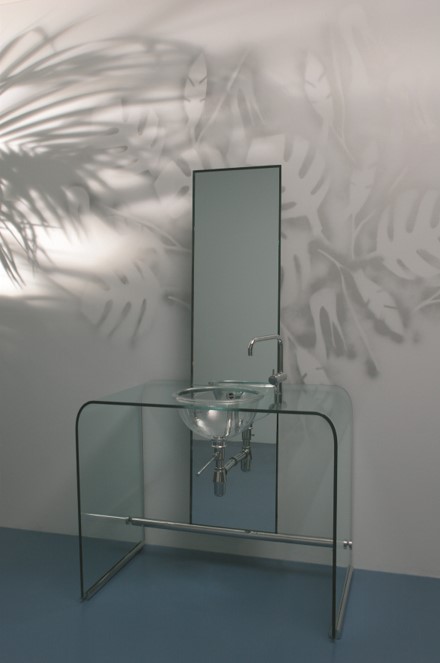 Il s’agit d’une plaque en verre d’une seule pièce horizontale courbée de chaque côté pour se poser au sol…telle un Arc sur lequel s’encastre un bac en verre soufflé…le tout faisant office de table d’eau, avec sa robinetterie VOLA de Arne Jacobsen posée sur le côté et un miroir un peu incliné, au bord de la table d’eau se posant sur un support métallique traversant la table près du sol et du mur, le tout donnant un espace magique jouant sur la transparence, la suspension et la lumière.
