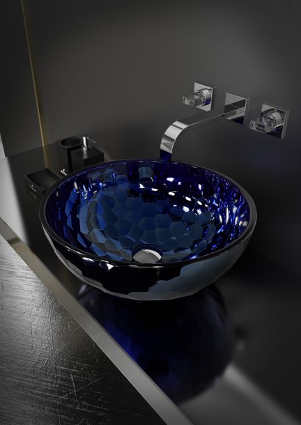 – meuble suspendu Charlotte en bois striés et feuille d’or rose et vasque à poser et plan en marbre noir,