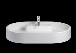 « Lavabo à poser avec écoulement libre et évacuation invisible.