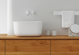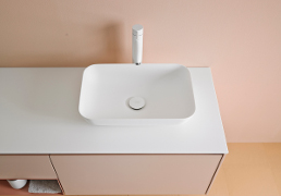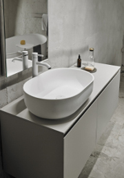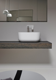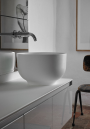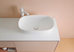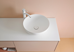 « Lavabo PRIME à poser sur ou sous le plan de toilette en Solidsurface mat. Avec bonde pour évacuation. Sans déversoir.