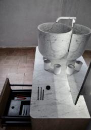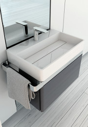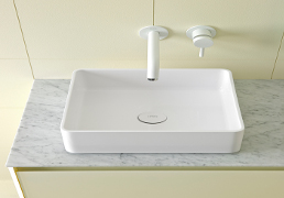 « Lavabo STRUCTURE sur plan de toilette en Céramilux sans déversoir. Avec bonde pour évacuation et possibilité de bonde pour robinetterie, vannes VA400 / VA395 obligatoire.