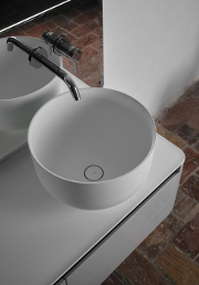 « Lavabo CERCLO à poser sur ou sous le plan de toilette en Corian avec bonde pour évacuation. Sans déversoir.