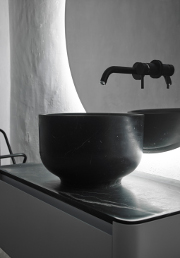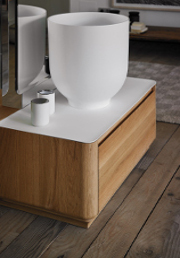 « Lavabo GLAZE à poser sur ou sous le plan de toilette en Corian avec bonde pour évacuation. Sans déversoir.