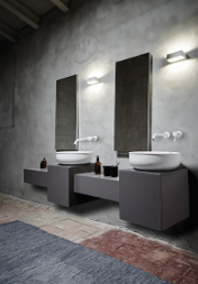 « Lavabo TAMBO sur plan de toilette en Solidsurface mat avec bonde pour évacuation. Sans déversoir et possibilité de bonde pour robinetterie. fixation au mur inclus.