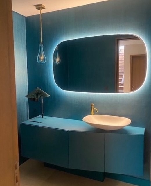 avec miroir périmétral éclairé carré et cercle central éclairé en LED.