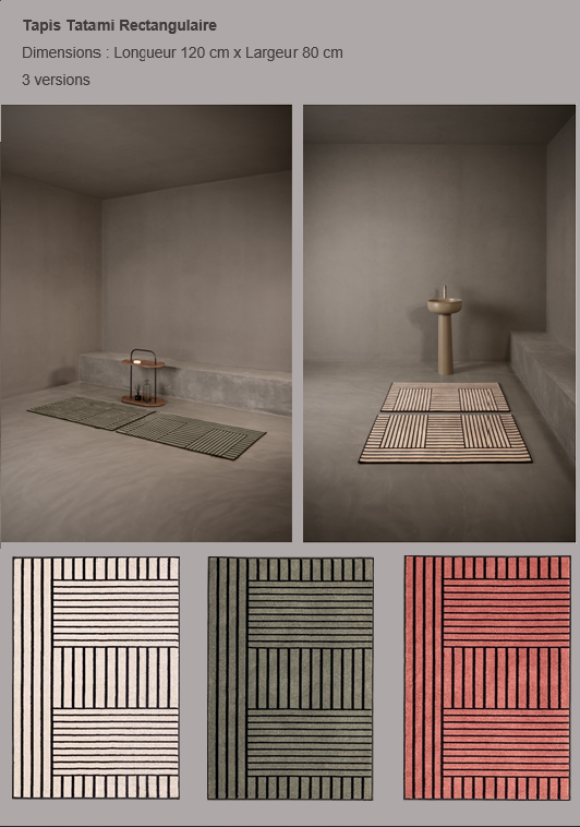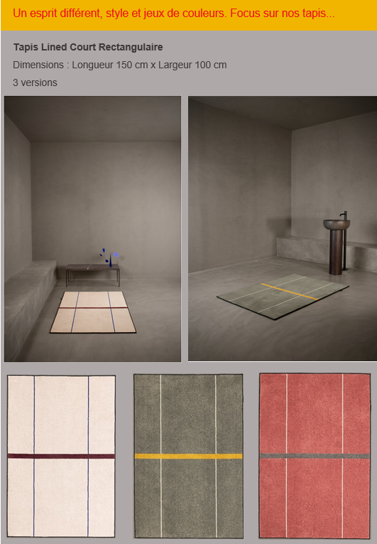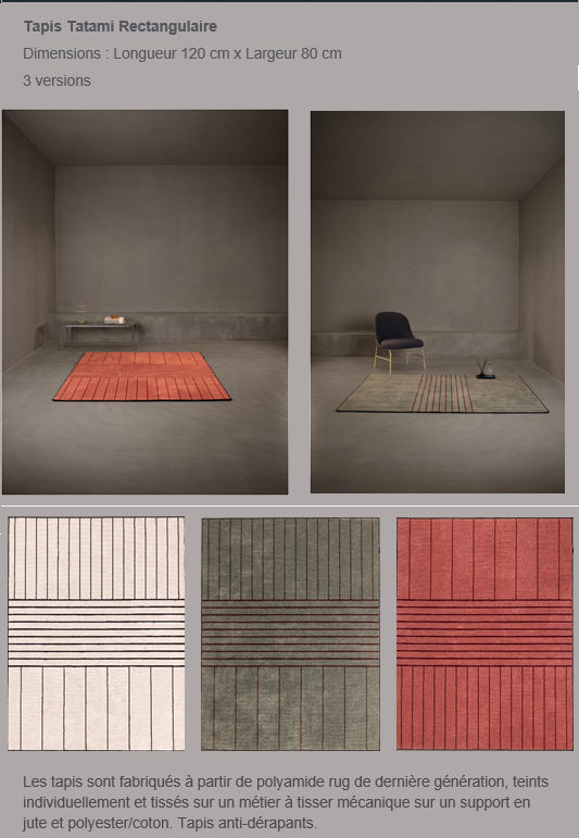 Les tapis de la collection Tatami ou Lined Court. Fabriqués à partir de polyamide, tissés individuellement sur métier à tisser sur une base de jute et un mélange de fibres synthétiques polyester, végétales et coton. Tapis anti-dérapant. Épaisseur 1 cm.