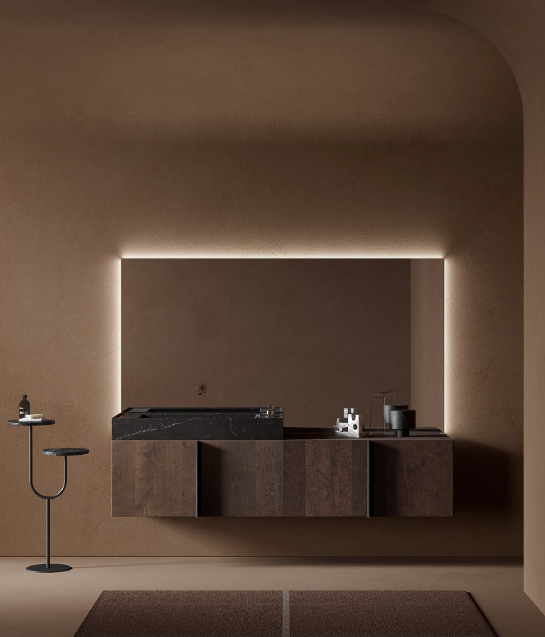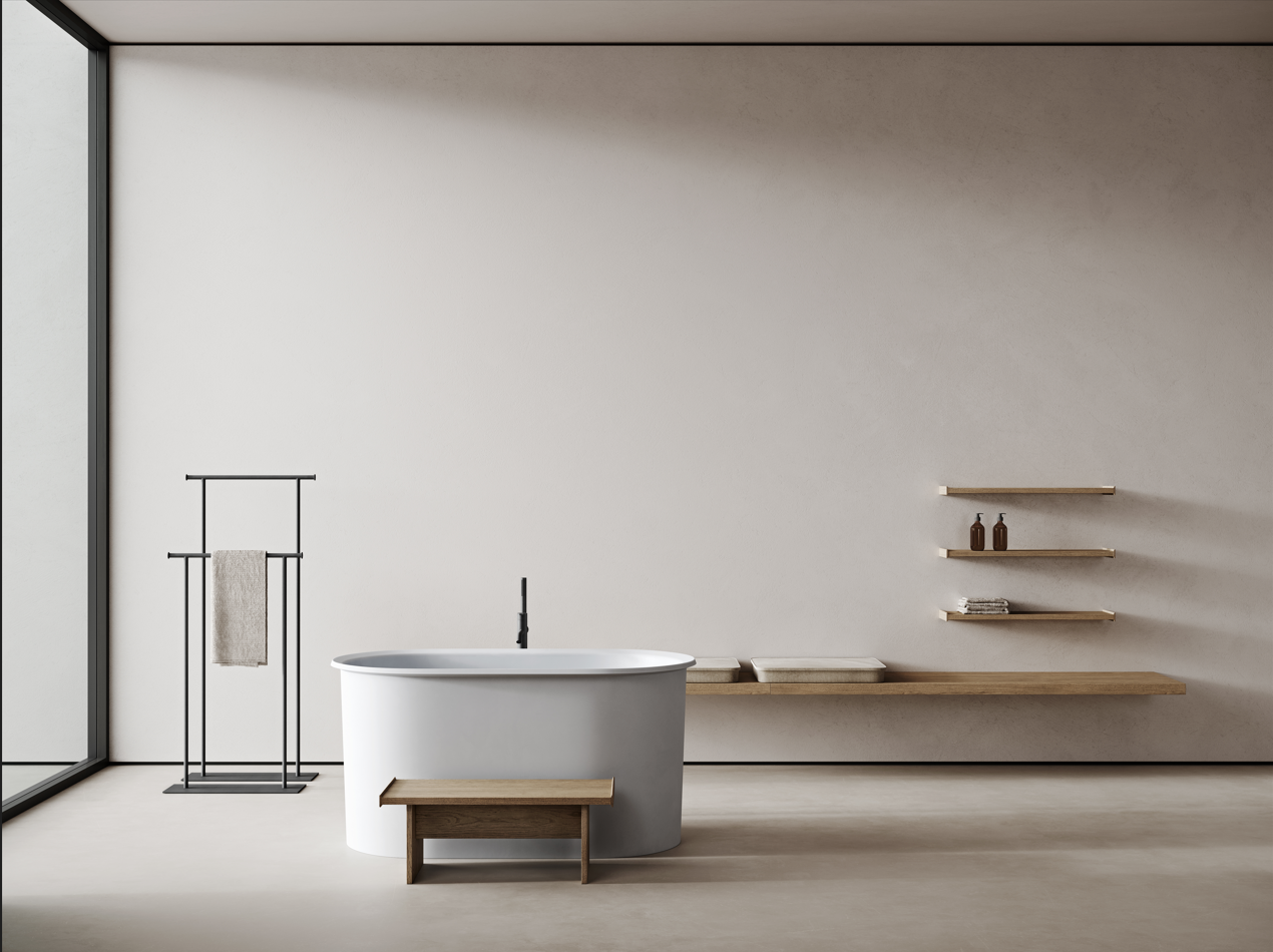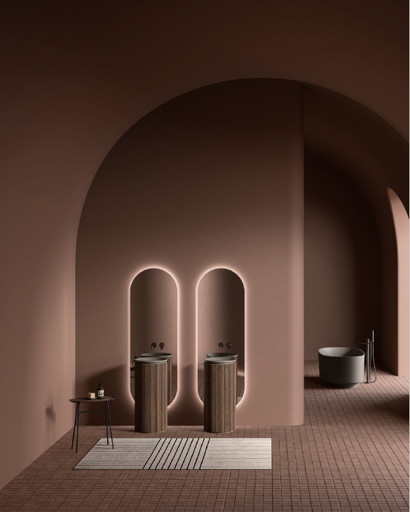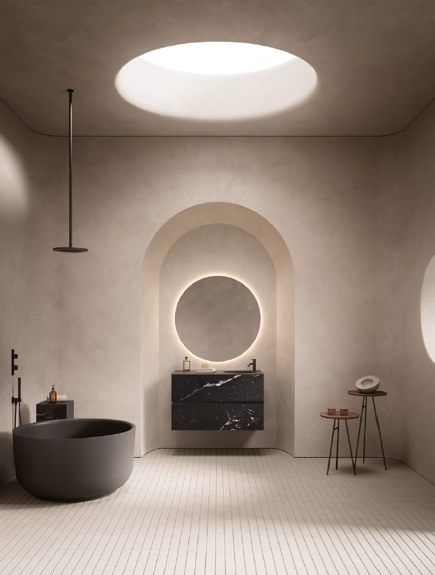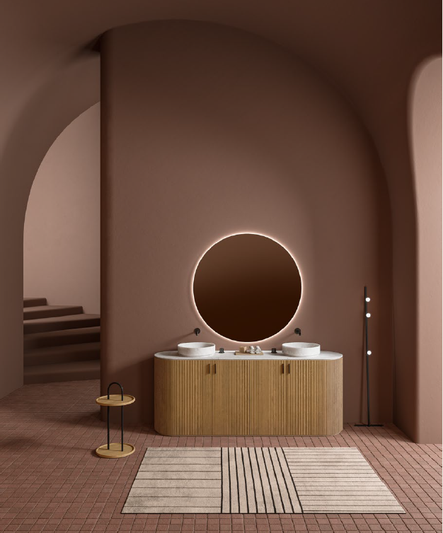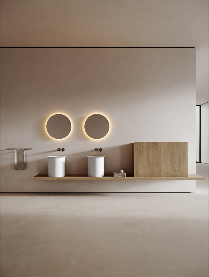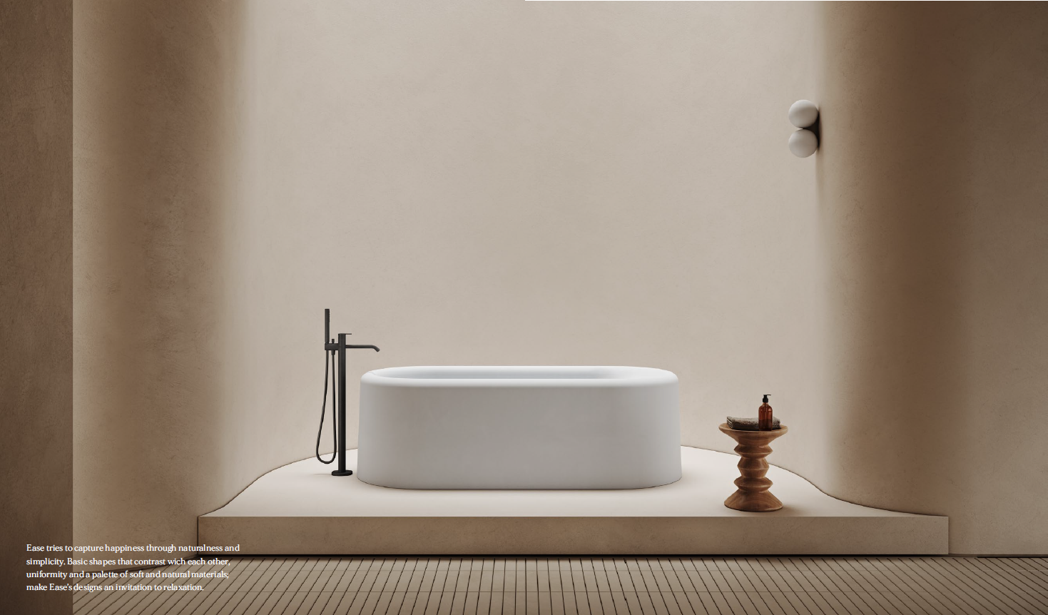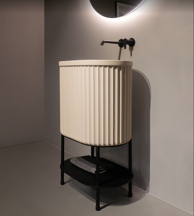 Ou la recherche de la forme intemporelle, de la douceur de la courbe pour la gestuelle autour du lavabo, s’imposant sur un socle porteur brut structural et minimal.