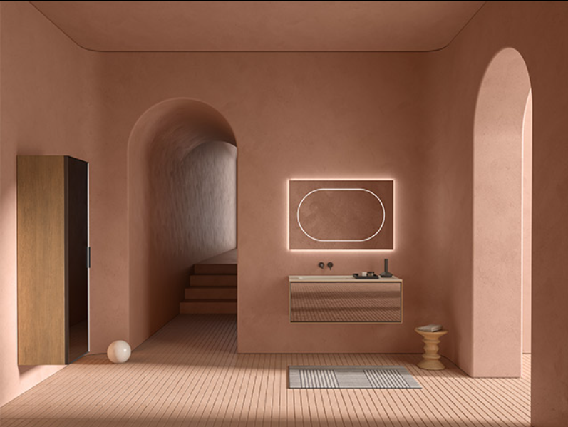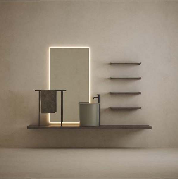 Sélection bacs à poser et free-standing Inbani collection Giro (Design Ludovica et Roberto Palomba) avec miroir Origin (design Seung Yong-Song) et vasques Prime (design Norm Architect) en couleurs U.H.S., soit 60 couleurs.