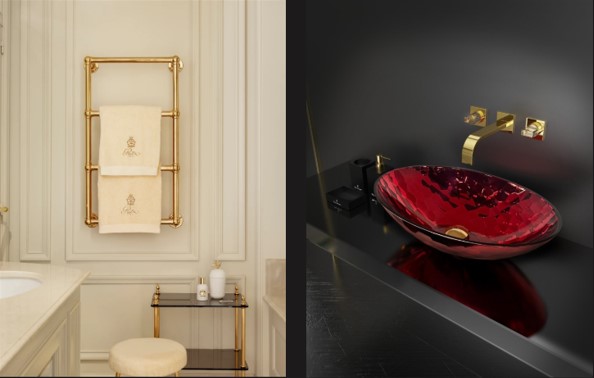 -Collections Gentry Home : baignoire Quartz Stone blanc, baignoire acier émaillé blanc et feuille d’or,